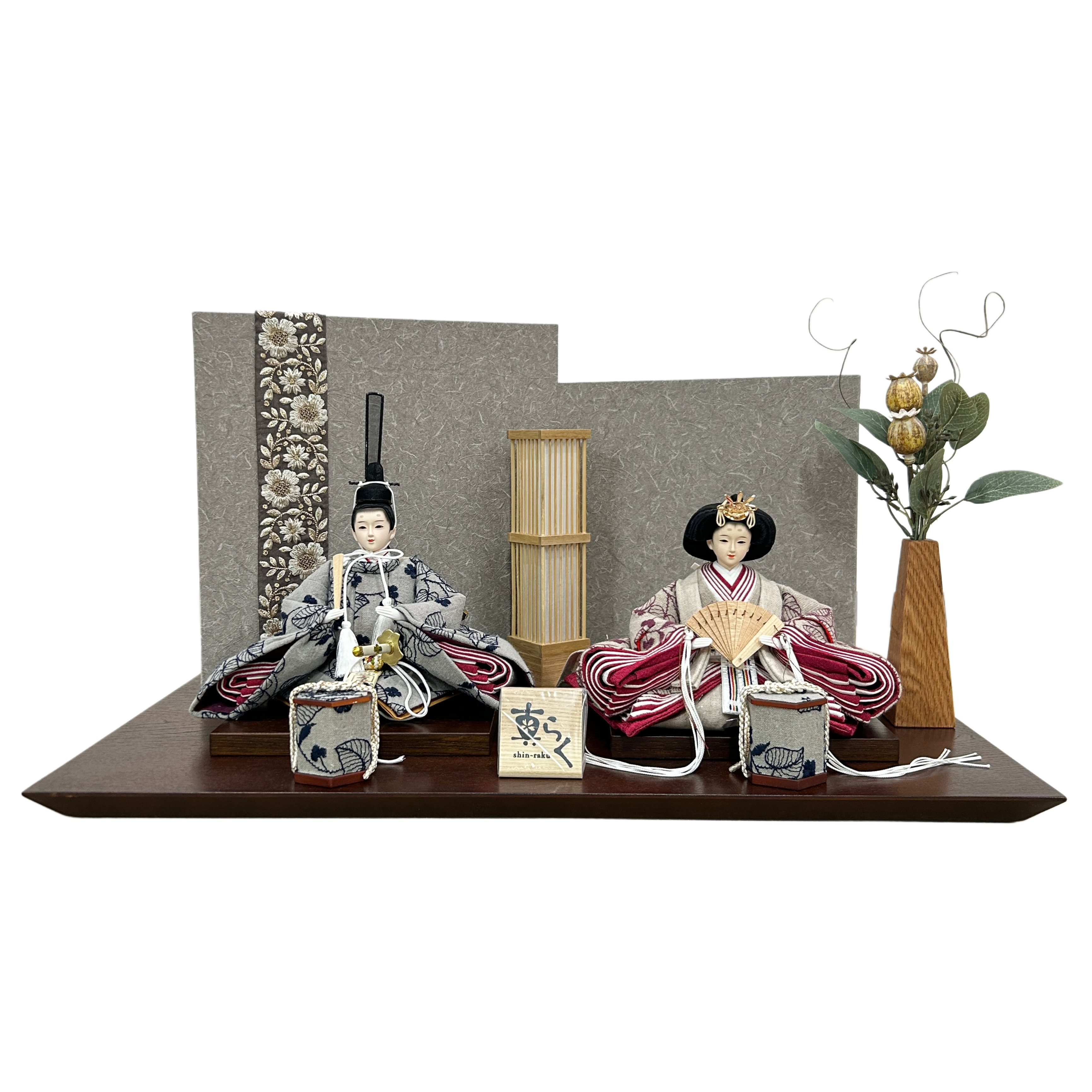 屏風はグレーベースに、同系色のグレーの刺繍を縦にあしらい、静かに個性を放つデザイン。全体の色調を抑えることで、お人形の刺繍や質感がより引き立つ構成になっています。