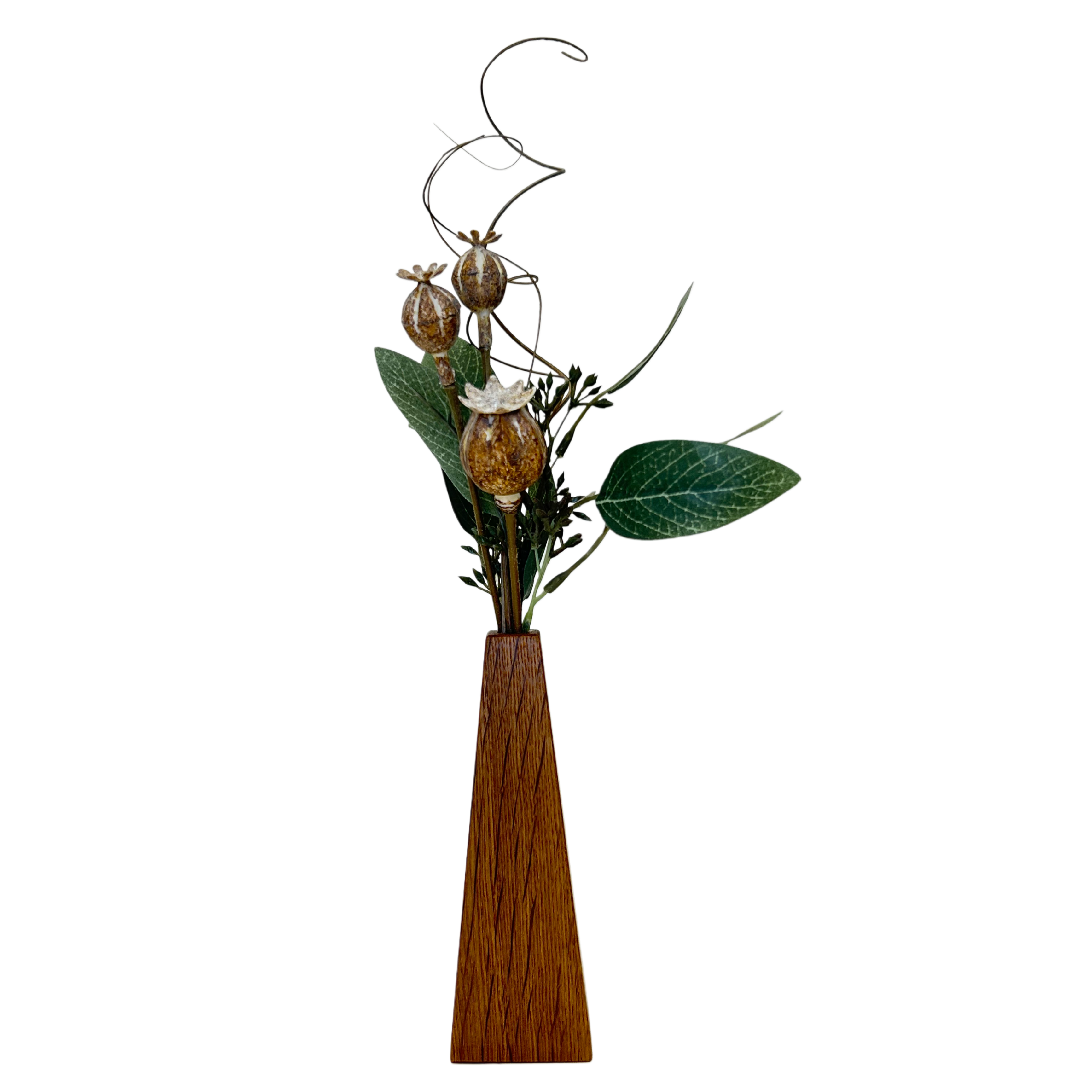 右側には、一輪挿しにポプラの芽を添えたフラワーオブジェを配置。自然の温もりと現代的な感性が調和し、まるでアートピースのような空気感をまとっています。