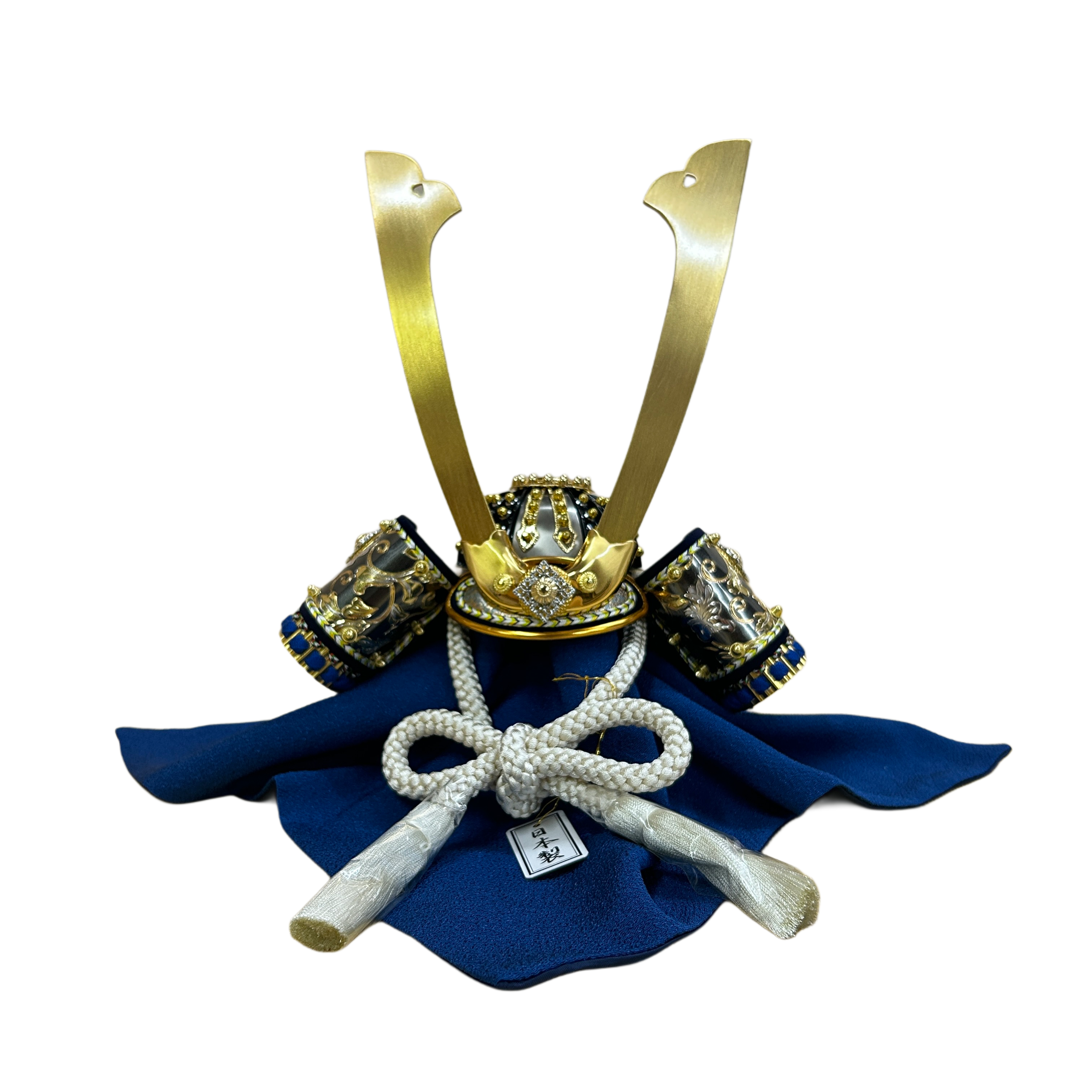 ブルーを基調とした落ち着いた色合いの中に、繊細な柄が美しく映え、兜をより一層引き立てています。