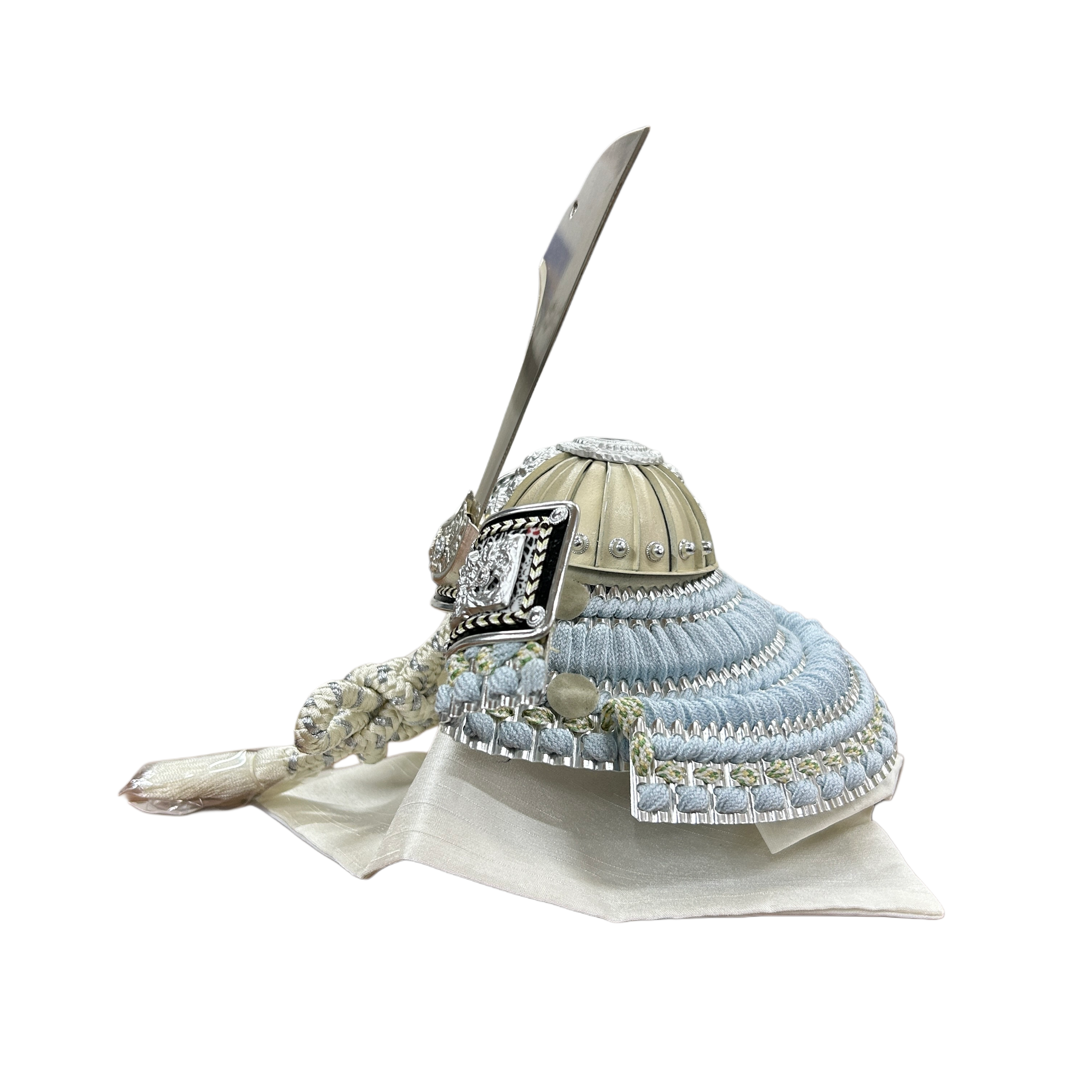 寛蔵作「翔」の兜を、水色威で仕立てた爽やかな一品です。