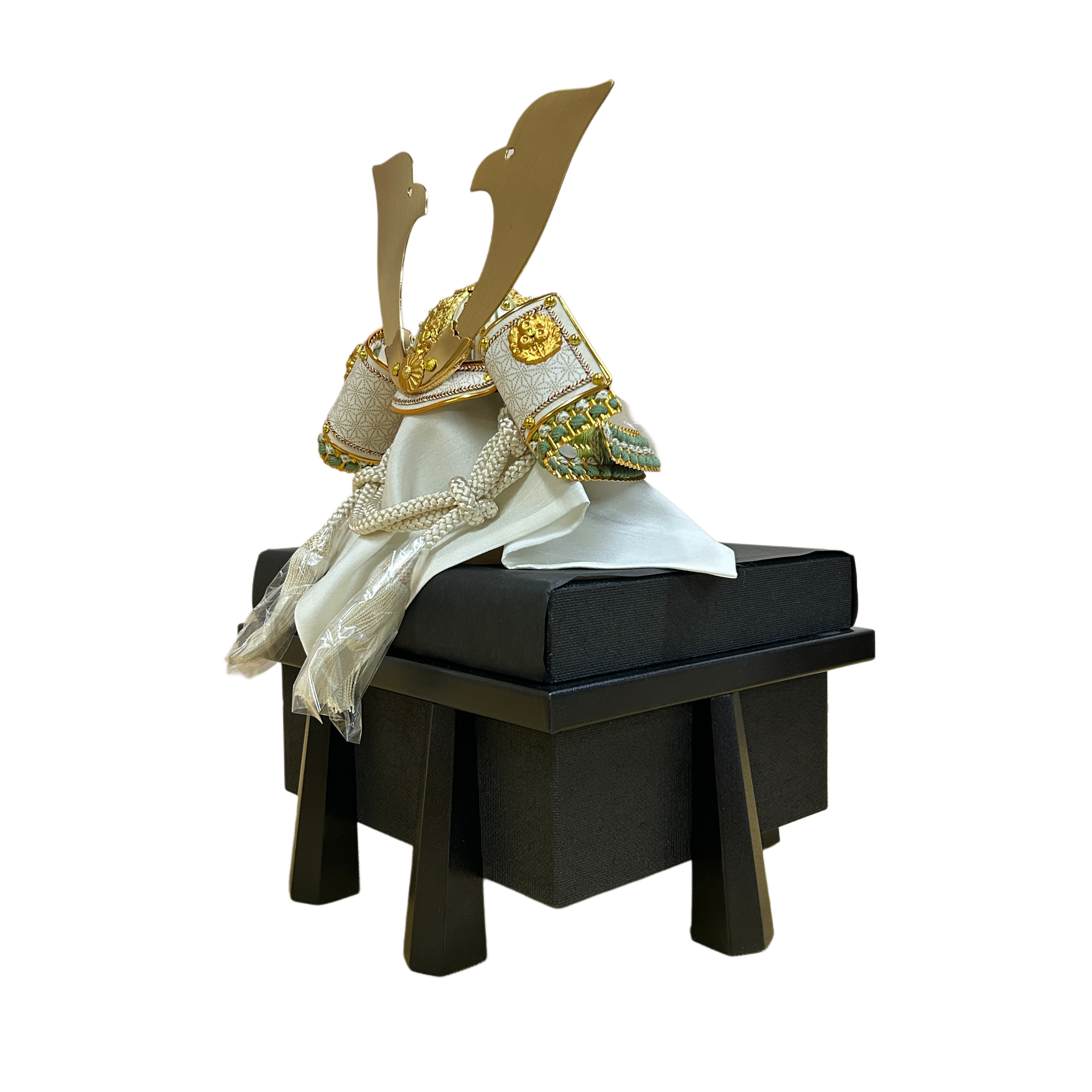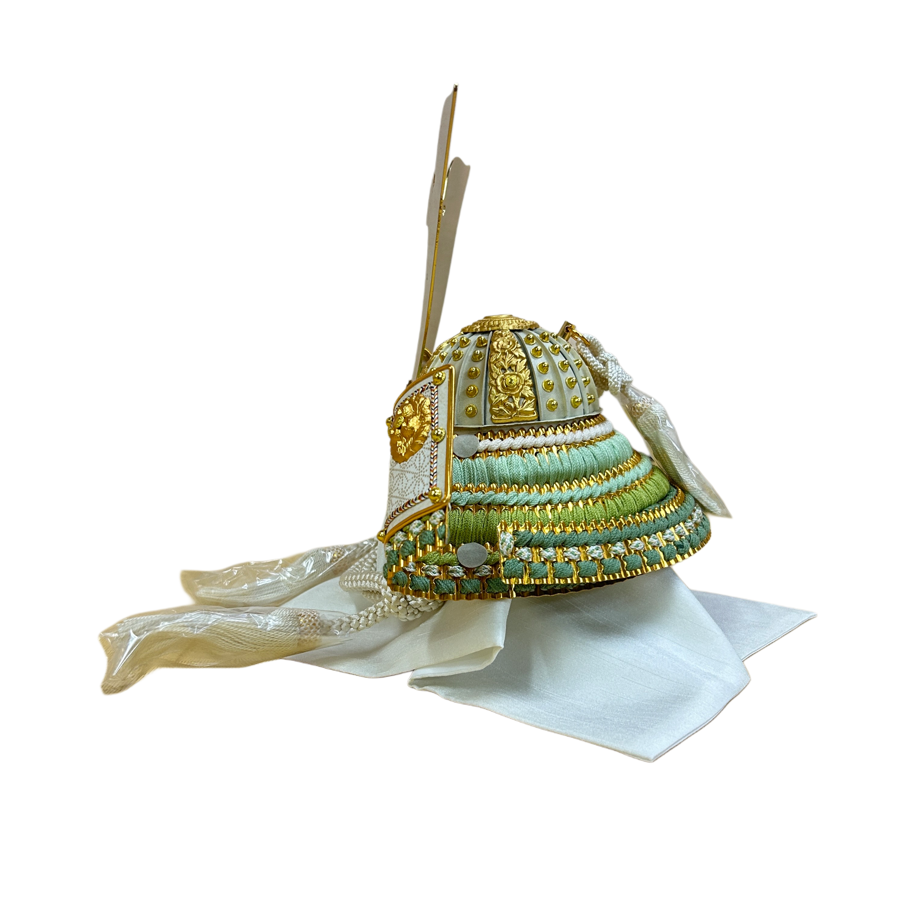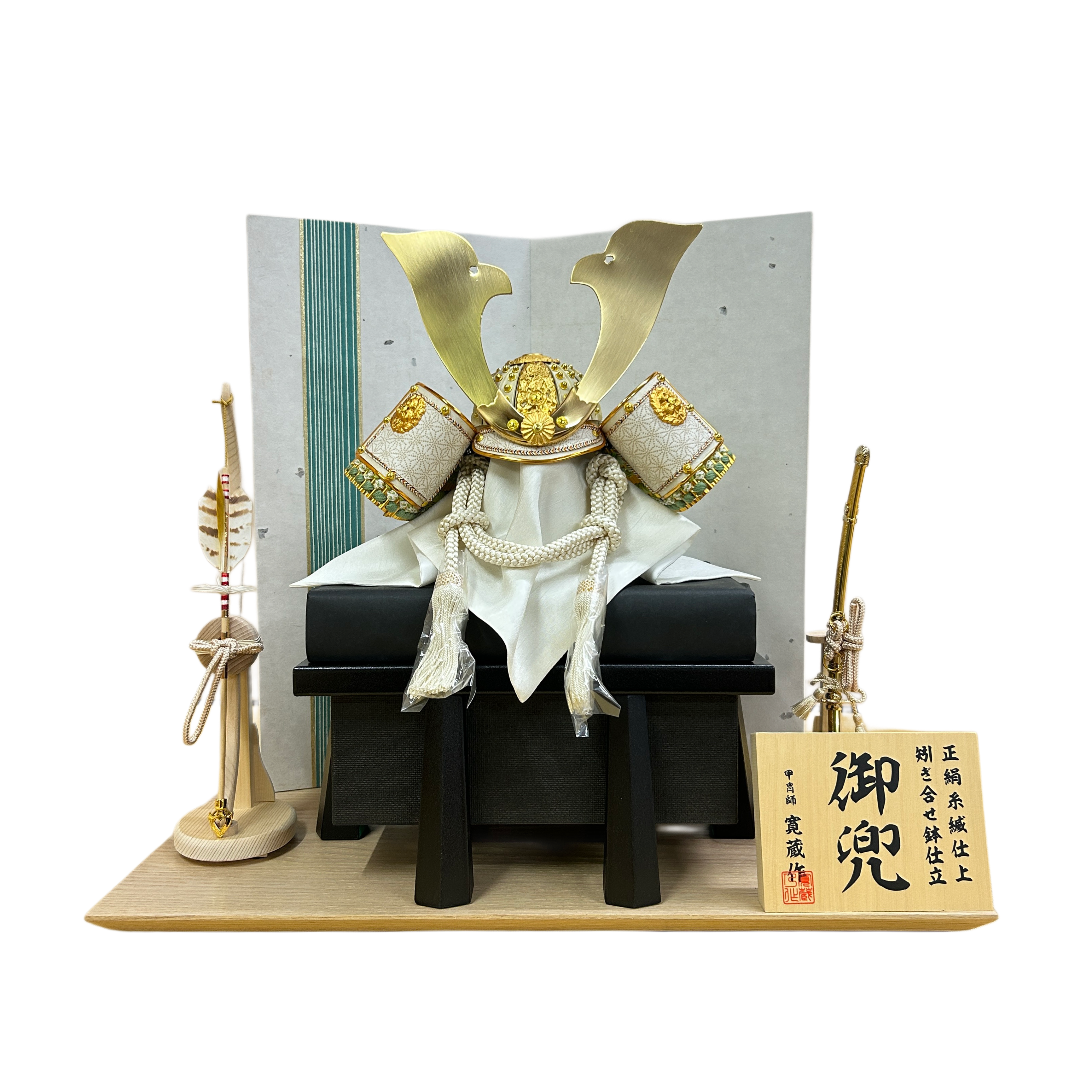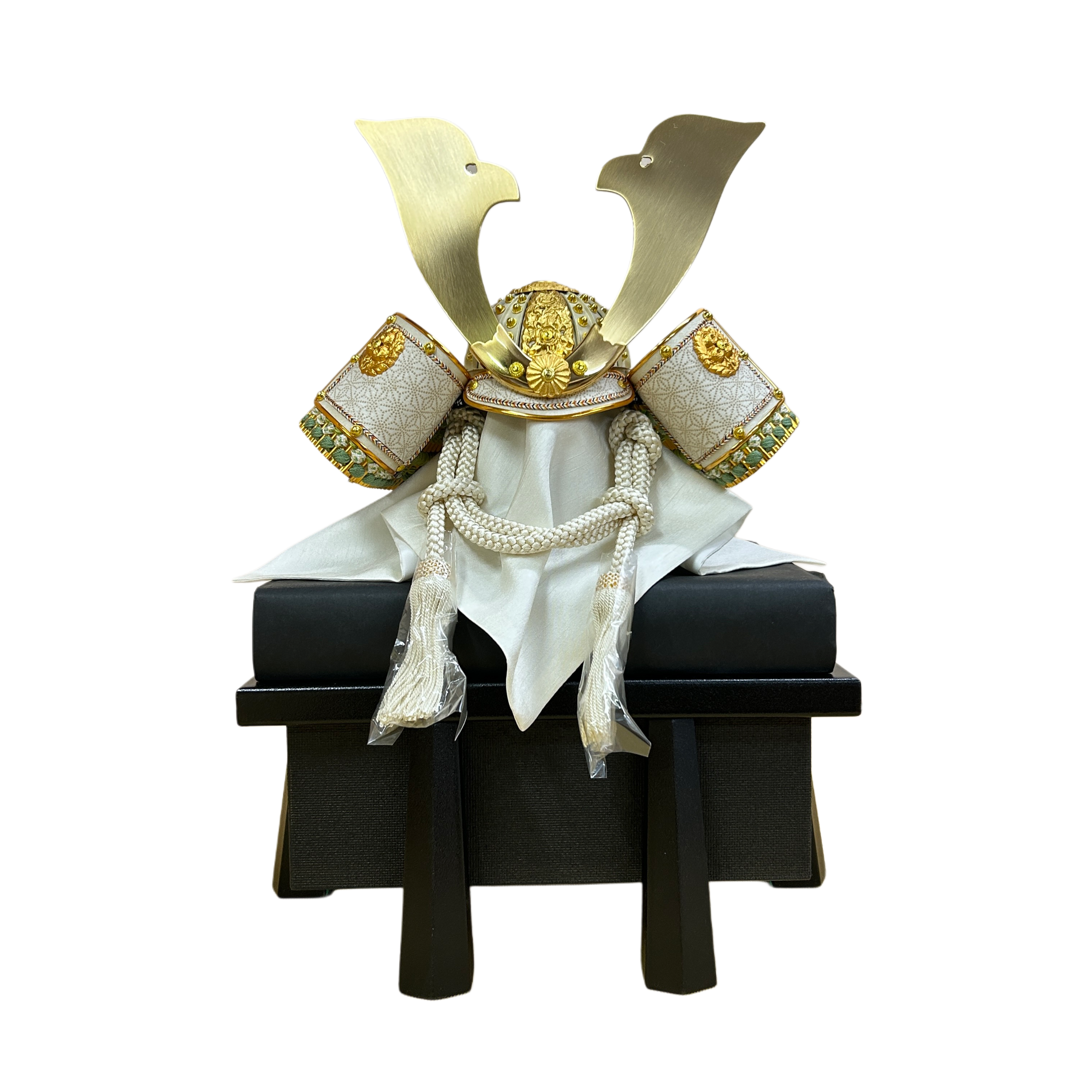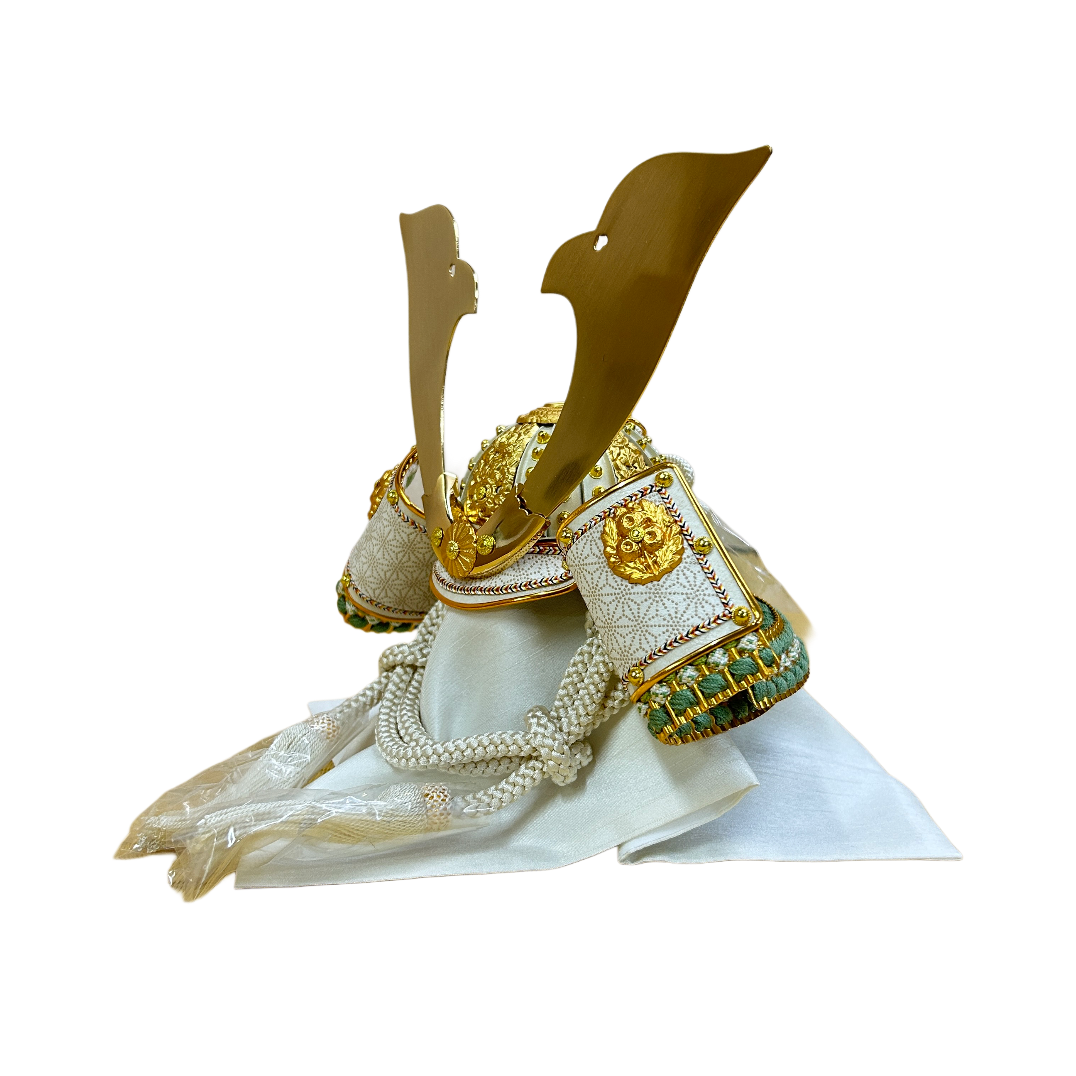 白を基調とした兜に、ゴールドの鍬形や金具が美しく映え、格式ある仕上がり。