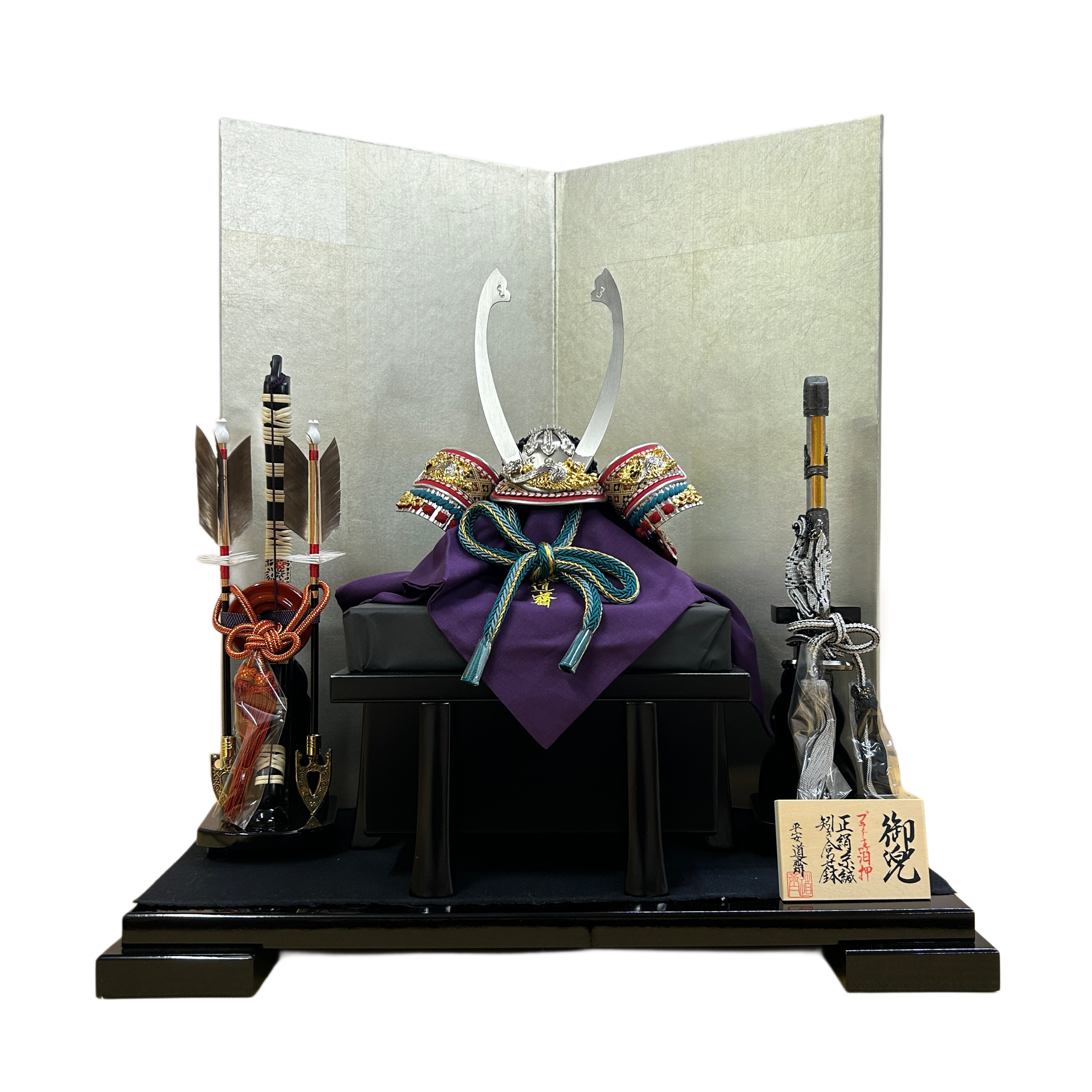 飾り台と屏風は落ち着いた色調でまとめられており、兜の美しさをより引き立てる上品な雰囲気に。横幅52㎝の平飾りで、程よい存在感がありながらも飾りやすいサイズ感です。