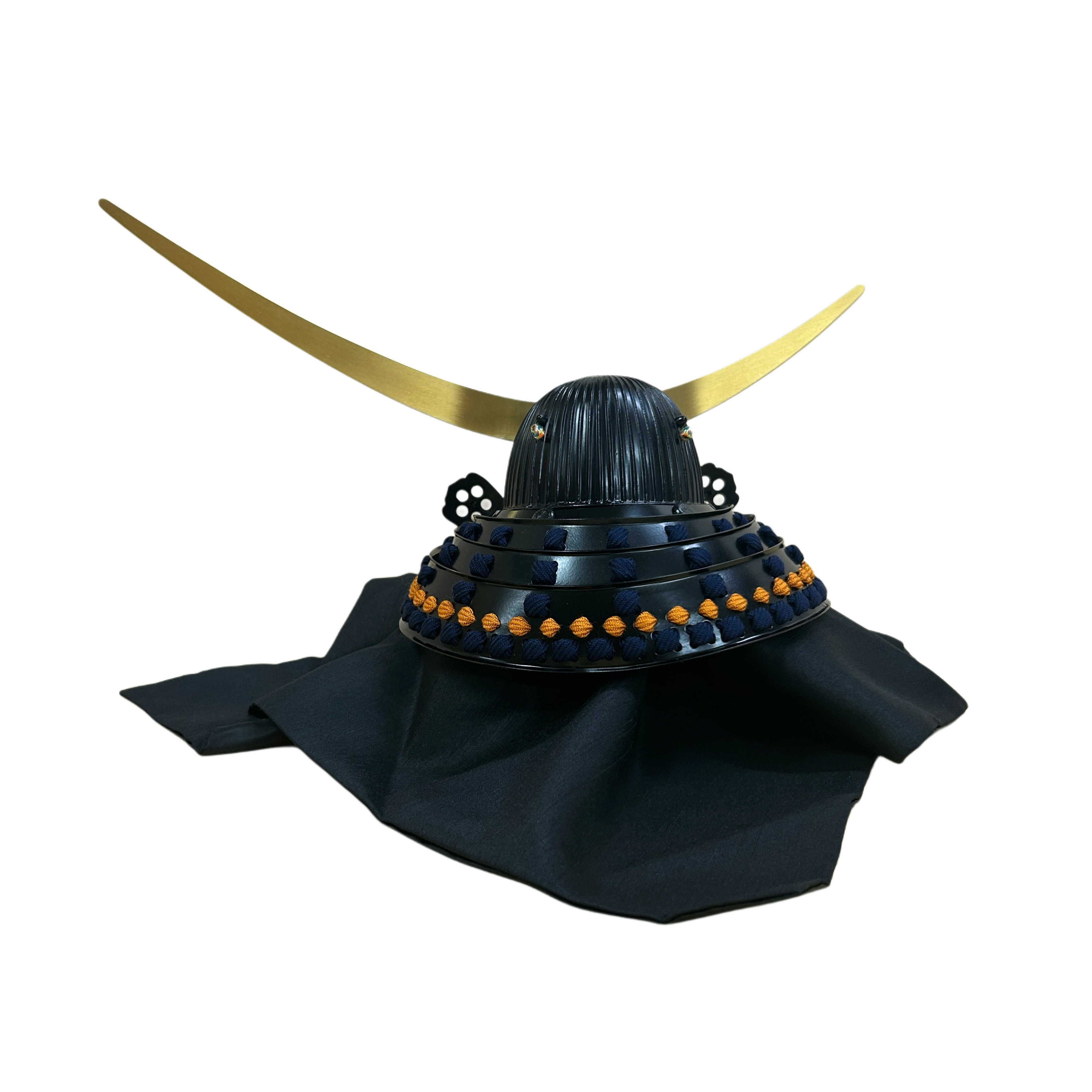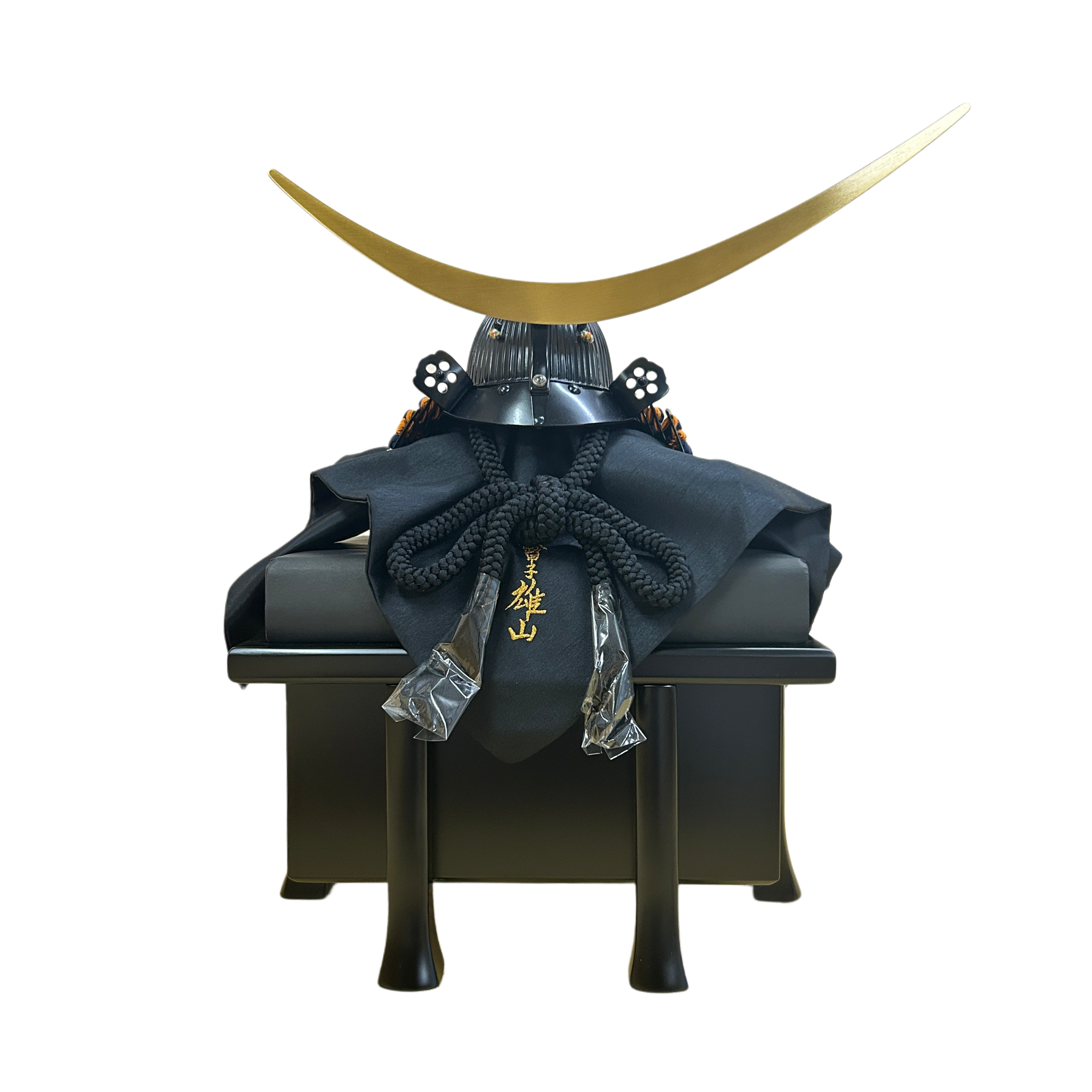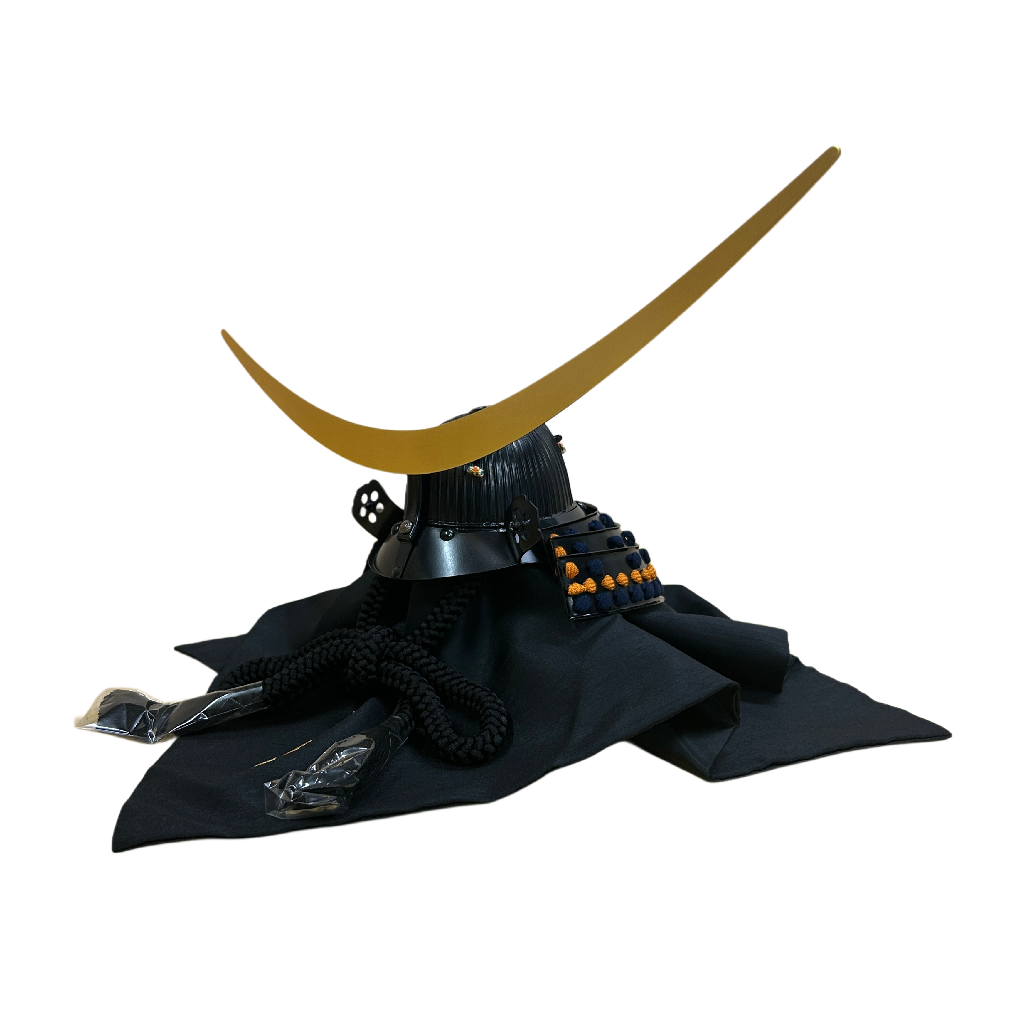 黒を基調とした重厚感のある兜に、金色の弦月前立が映え、戦国武将らしい威厳を感じさせます。
