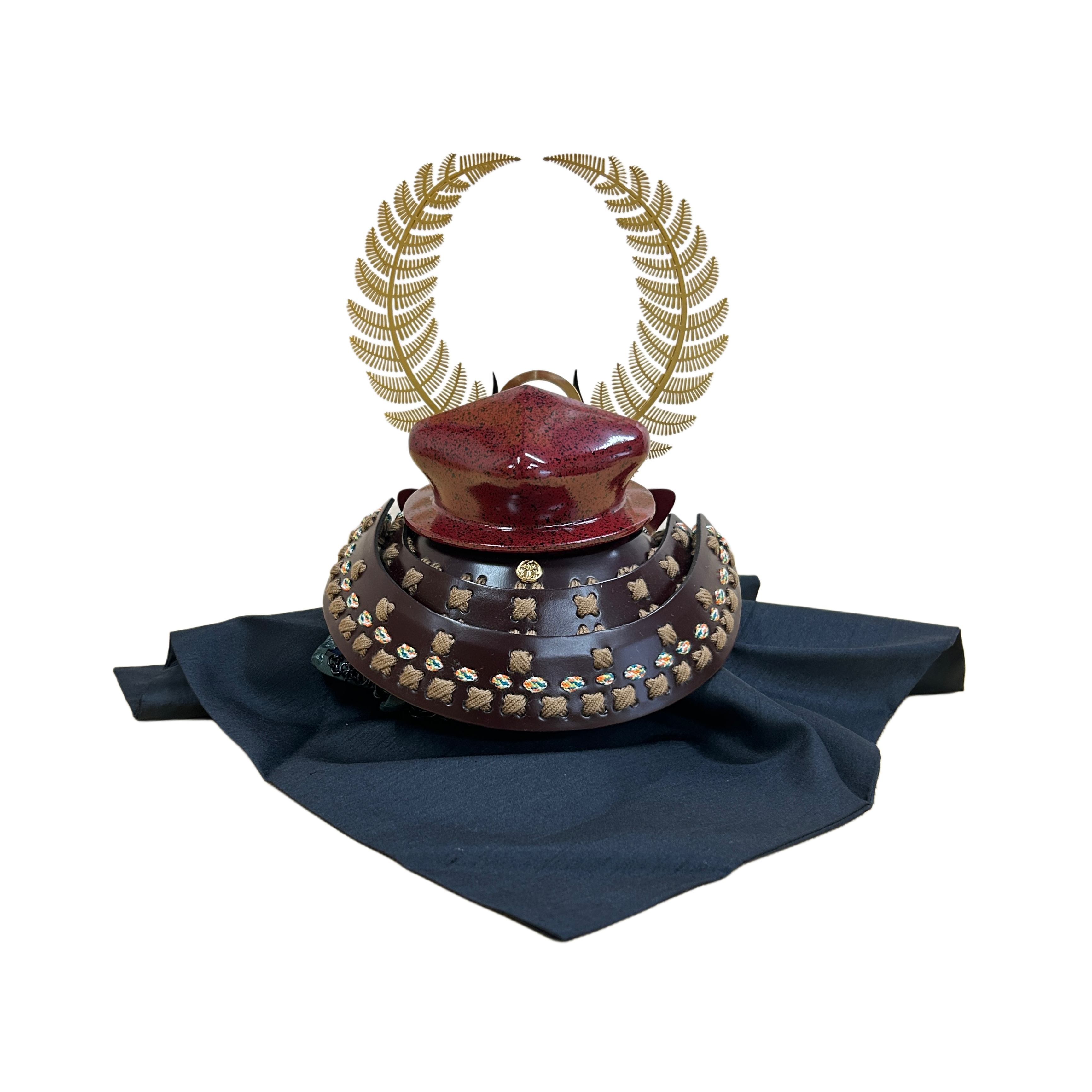 忍び緒には鮮やかな赤を用い、伝統的な武将兜らしい格調高い仕上がりとなっています。