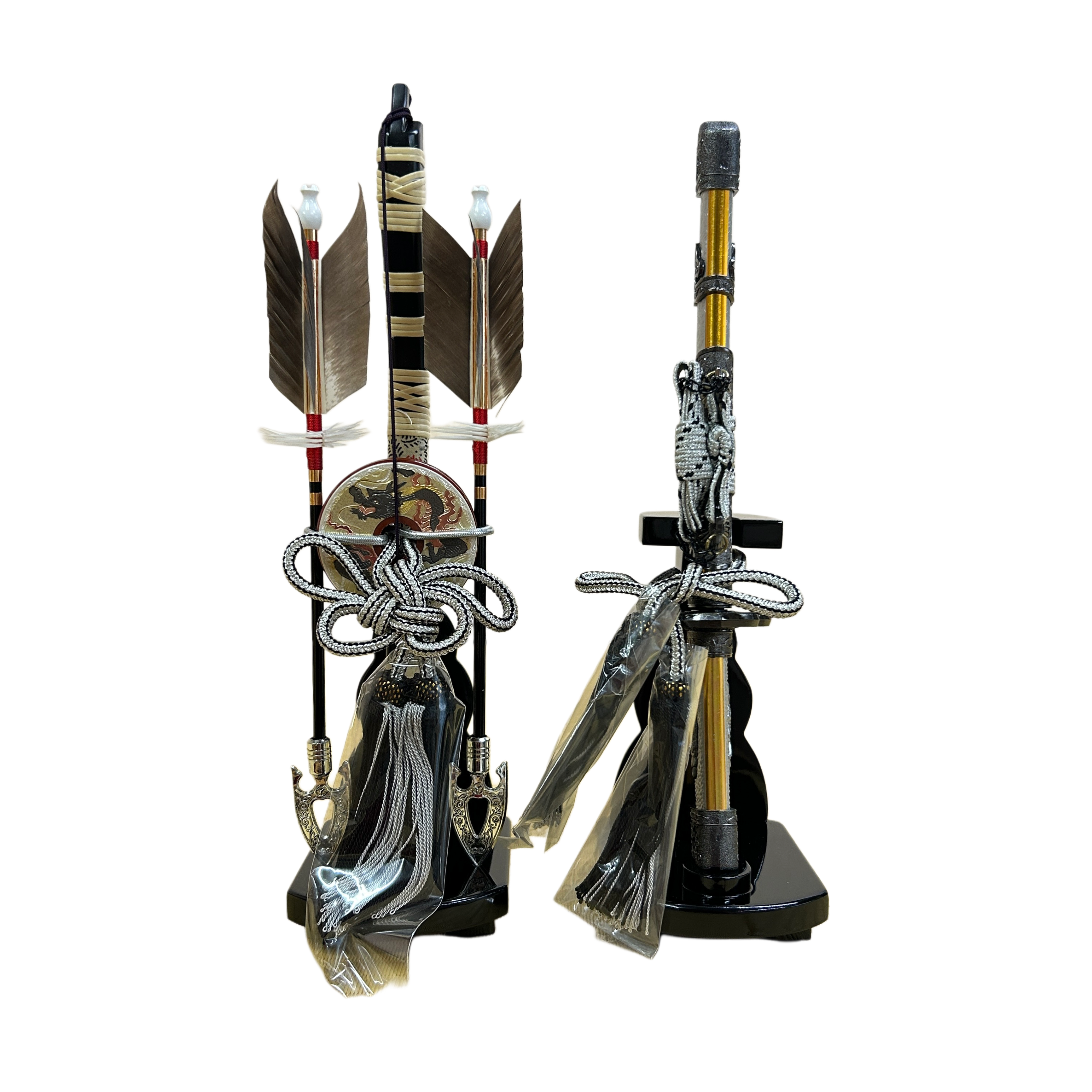 両脇には弓太刀を配し、武将飾りとしての威厳と均整のとれた美しさを感じられる構成です。