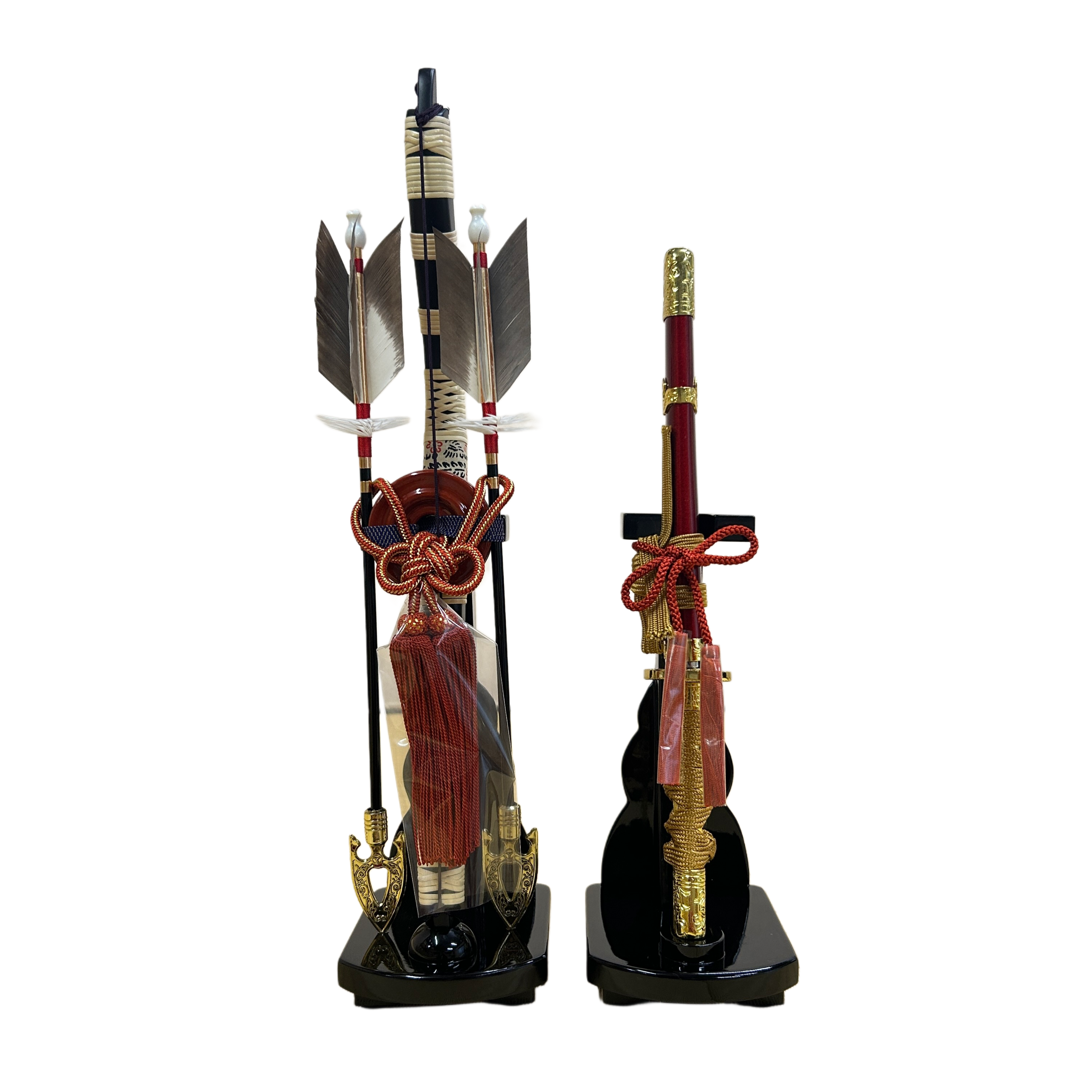 中央に兜を据え、両脇に弓太刀を配したバランスの良い構成で、節句飾りとしての風格を感じさせます。
