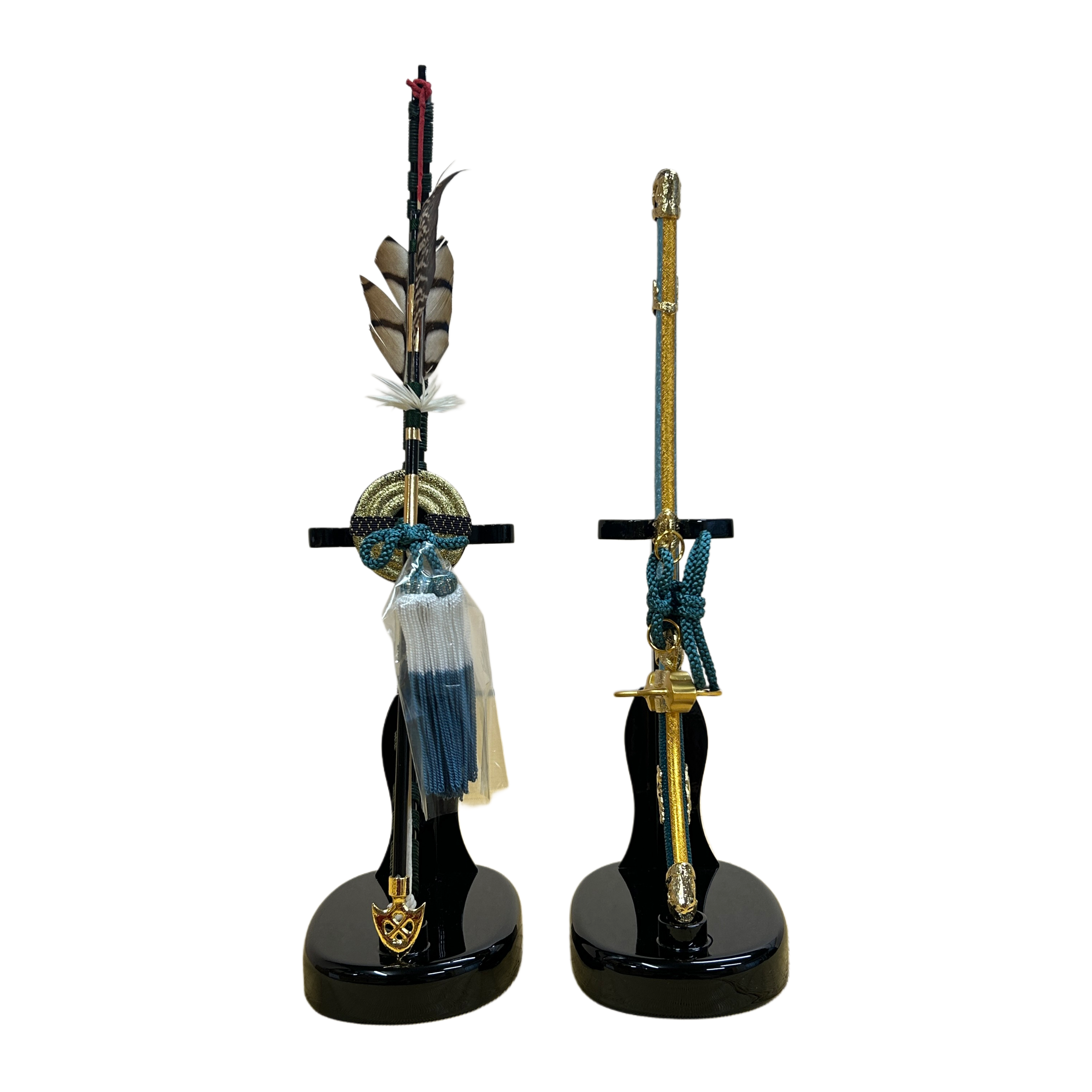 左右には弓太刀を配し、節句飾りとしての格式を整えた構成となっています。